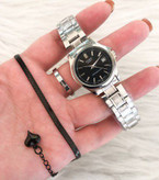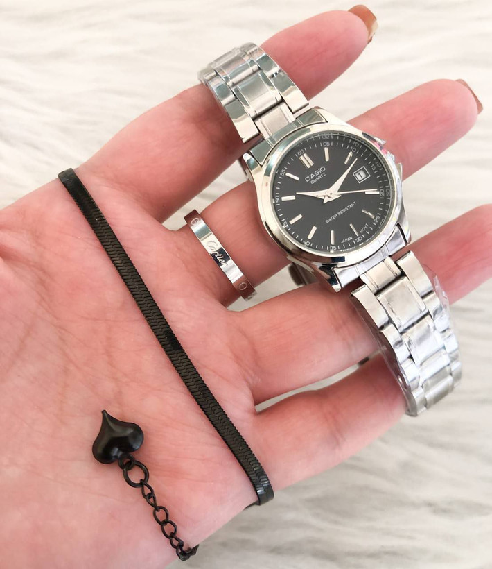ست ساعت کاسیو زنانه صفحه مشکی +دستبند+حلقه نقره ای