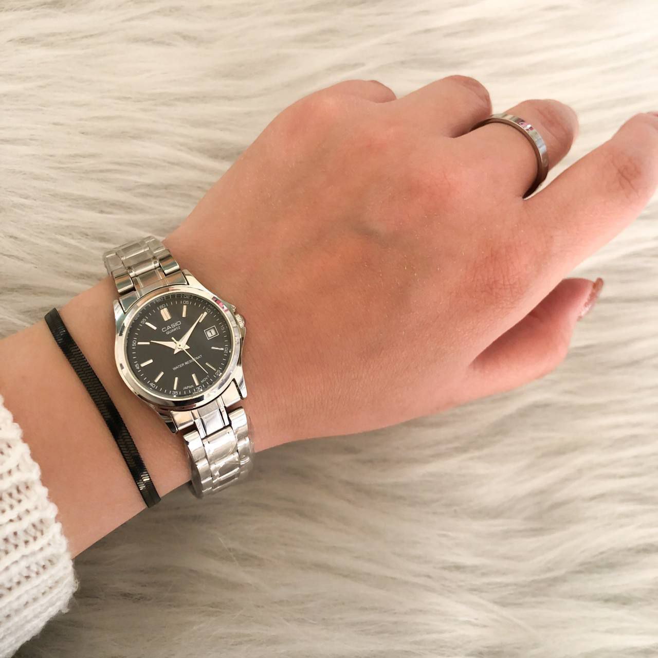 ست ساعت کاسیو زنانه صفحه مشکی +دستبند+حلقه نقره ای